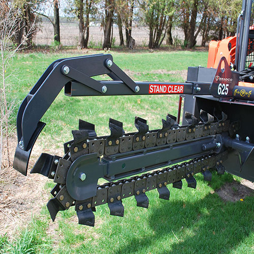 Bradco® 625 Trencher dilengkapi boom dengan panjang tetap dengan idler bermuatan pegas yang dapat disetel sendiri dengan pelindung batu penuh.
